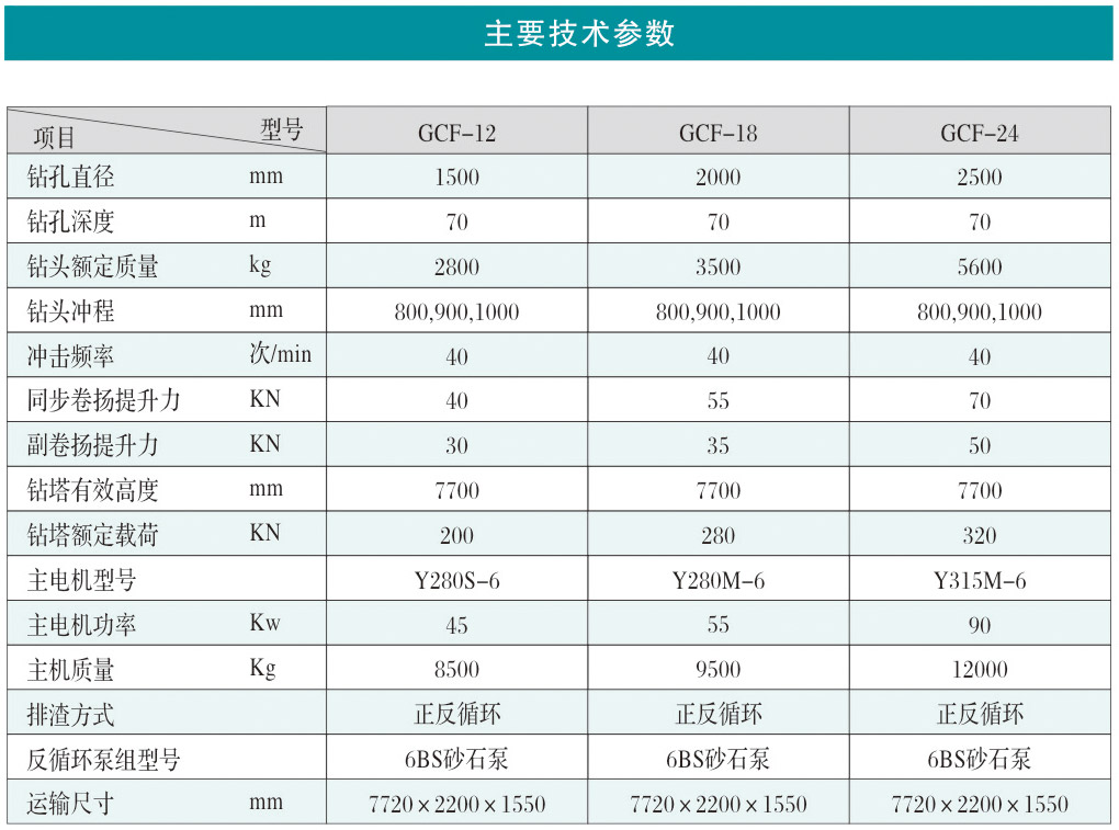 GCF型系列沖擊反循環工程鉆機為我公司研制的基礎工程施工設備,適用于土層,巖層,尤其適用于卵礫石、膠結卵礫石等復雜地層的基礎施工,廣泛應用于橋梁基礎、電站基礎、地下連續墻、水井鉆鑿等工程施工。該鉆機技術先進,性能可靠,價格適中,為同類鉆機之精品。